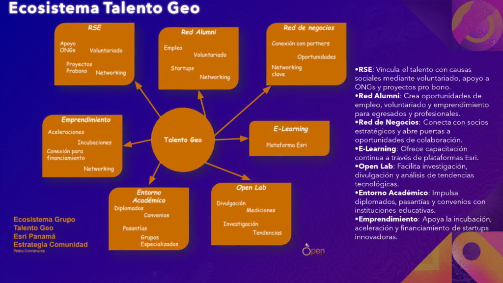 El Ecosistema Talento Geo de Esri Panamá conecta estudiantes, profesionales, instituciones y empresas para impulsar el desarrollo geoespacial en el país. A través de siete áreas estratégicas —RSE, Red Alumni, Red de Negocios, E-Learning, Open Lab, Entorno Académico y Emprendimiento— se crean oportunidades de aprendizaje, colaboración e innovación.